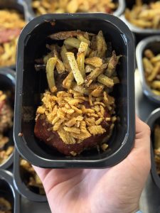 50/50 Cauliflower Mashed Potatoes, Homade Chicken Gravy, Adobo Seasoned Shredded Chicken, Onions, Celery, Roasted Peas and Carrots.