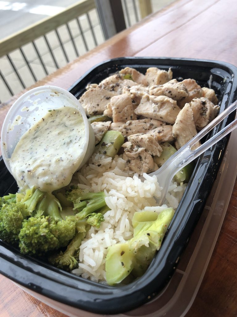 Ingredients- Chicken, Greek Seasonings, Assorted Veggies, Homemade Tzatziki Sauce, Jasmine Rice