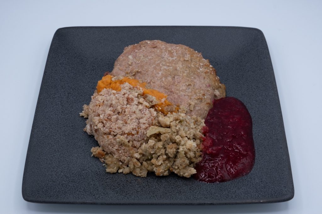 Ingredients- Turkey, Mashed Sweet Potato Topped With Crushed Pecans, Cranberry Sauce (Cranberries), Homemade Stuffing, Seasonings